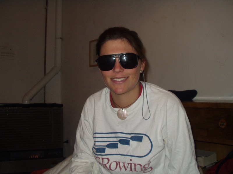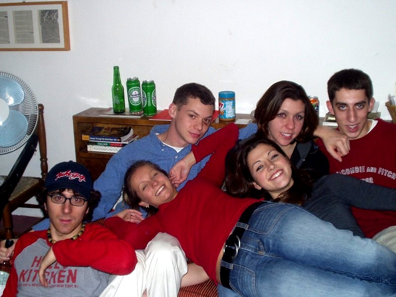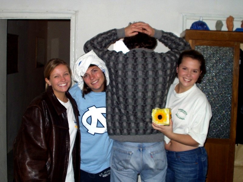 Jamie, Katie, Hansel and Whitney pay tribute to Joshua Stein by holding an impromptu fashion show while he's in Amsterdam. Jamie sports the Indiana Jones coat; Katie has Carolina Fever; the sweater, in the words of Robby, "looks like something my cat hacked up;" and Whitney rocks the t-shirt Josh got for being an all-county offensive lineman. If he finds this picture in the next three days, don't expect to see me again. |
