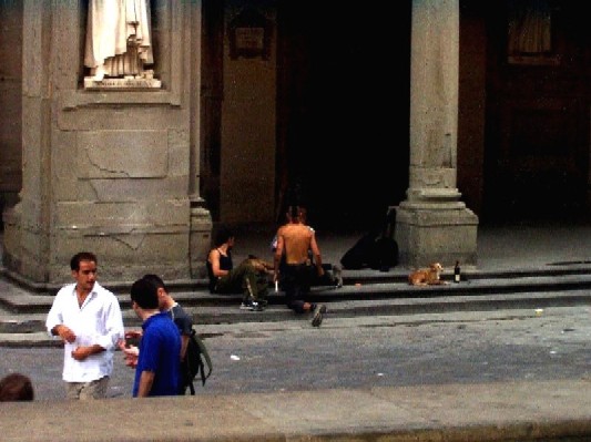 These thugs were hanging out at the Uffizi, which supposedly houses more first-class art per square inch than any other museum in the world. Every time someone would walk by, the dog would attack, and they'd laugh and yell Italian profanity. I found it funny they'd be boozing outside this world-class musuem, so I took a picture. From behind a statue, across the street... |