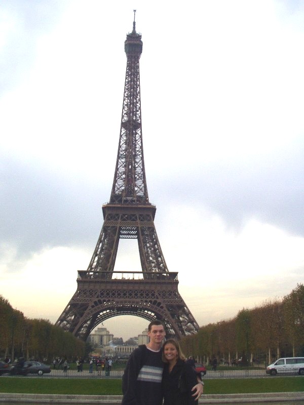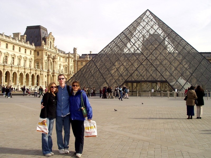 Jamie, Katie and I in front of I.M. Pei's controversial glass pyramid which marks the entrance to the Louvre, home of the Mona Lisa. Thanks, Katie, for this picture. She had to use the W.C. for about 45 minutes, but I demanded a retake after I was randomly kicking my leg up in the air like Fred Astaire in the first picture. That picture was immediately destroyed. |